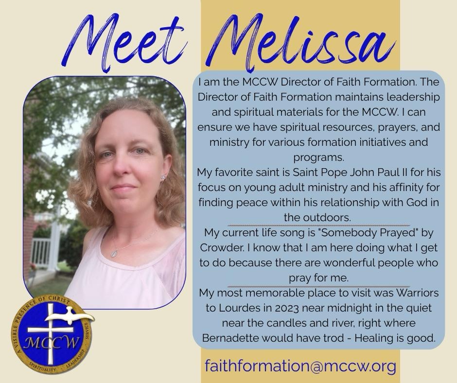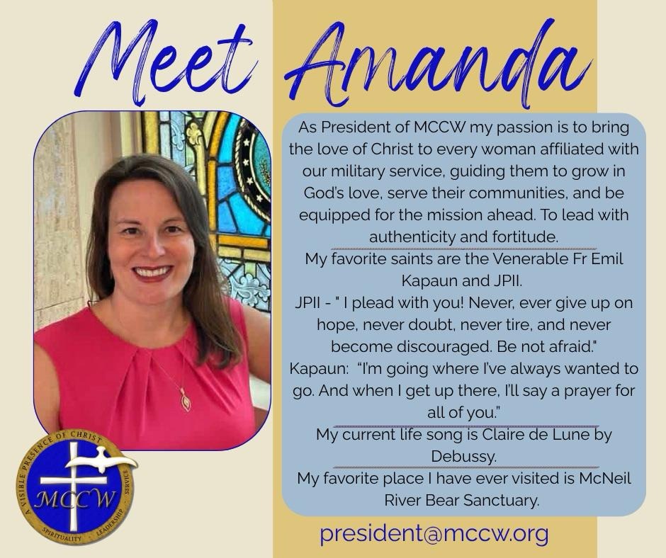 The Military Council of Catholic Women (MCCW) is a Catholic apostolate serving U.S. military-affiliated women worldwide, including active-duty service members, spouses, veterans, widows, retirees, and women who support the mission of the Armed Forces.