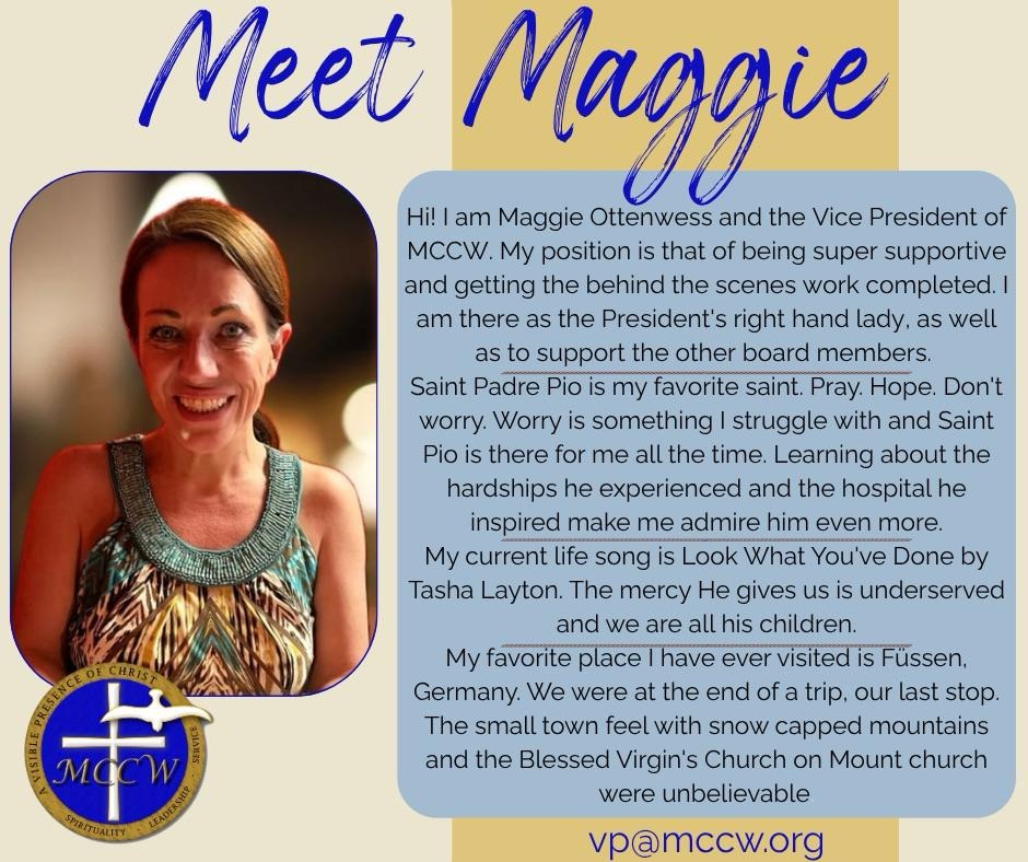 Mary, under the title Our Lady of Good Counsel, is the Patroness of MCCW. In all our work, MCCW leaders look to the Mother of God for guidance and a better understanding of her Son’s will for our lives and our ministry.